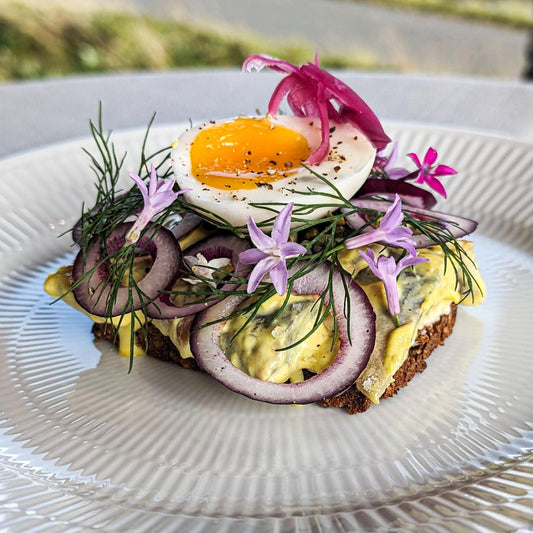 Karrysild med smilende æg, rødløg og kapers