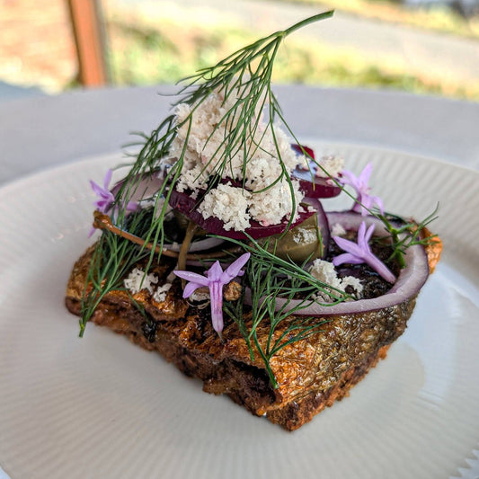 Lun stegt sild med peberrod, rødløg, kapers og rødbeder